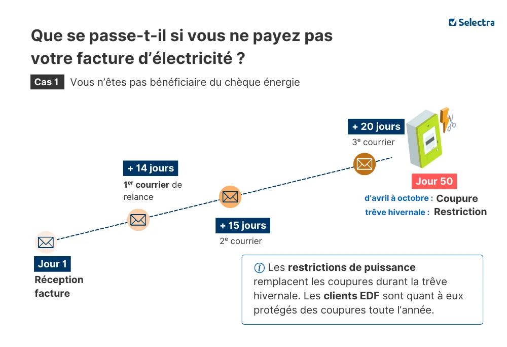 En cas de non-paiement, les clients bénéficiaires du chèque énergie reçoivent un courrier leur informant d'un délai supplémentaire de 30 jours pour régler la facture ou trouver un arrangement. Si aucune action n'est prise par le client à la fin de ce délai, le fournisseur peut demander la réduction de puissance jusqu'à 1 kVA pendant au moins 60 jours, suivie d'une coupure de courant.